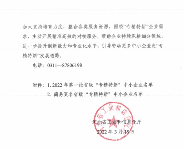 2022年3月19日,河北省工業(yè)和信息化廳公布了2022年河北省“專精特新”中小企業(yè)名單,河北古城香業(yè)集團股份有限公司被認定為“專精特新”企業(yè)。